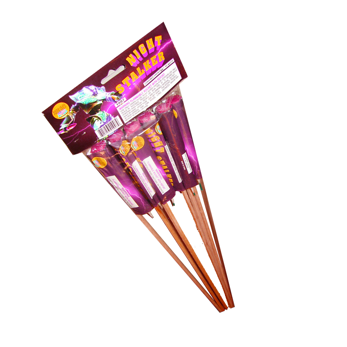 Night Stalker Rockets deliver on packaging, height, performance and color. In this 4 pack rocket you get a high performing whistling and crackling rocket.